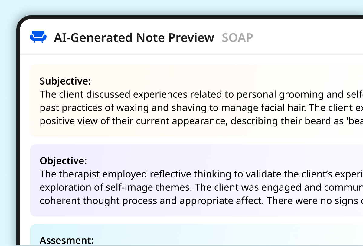 - Compliance-ready. AI draft session notes follow standardized formats to help support clear, audit-ready documentation.