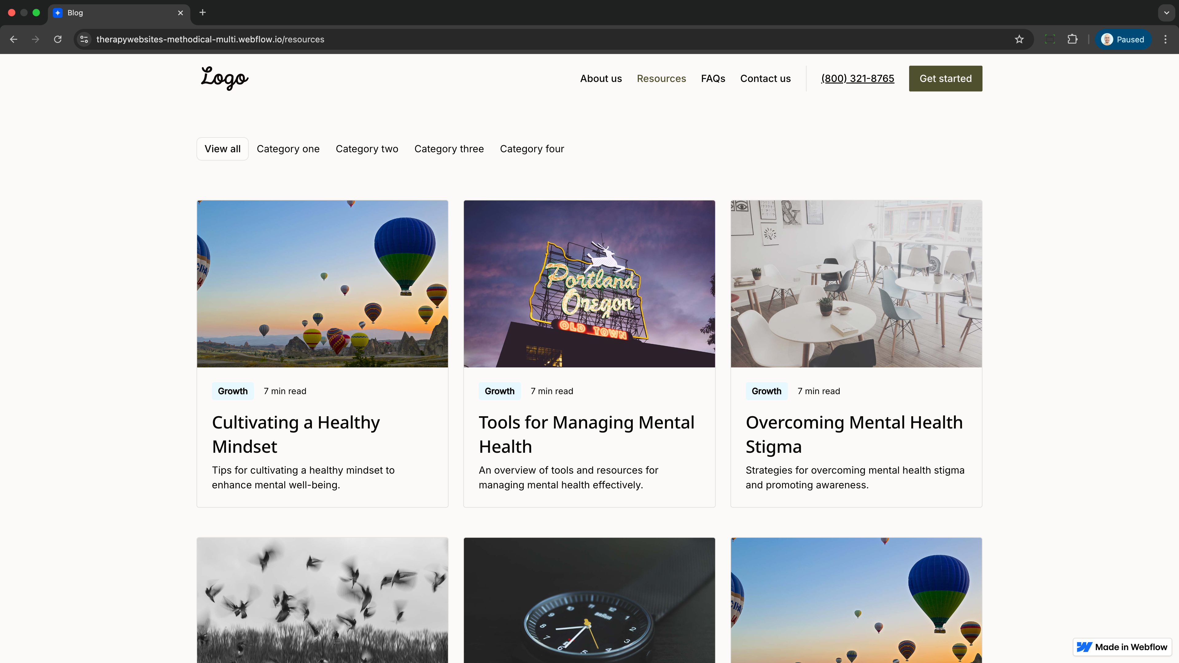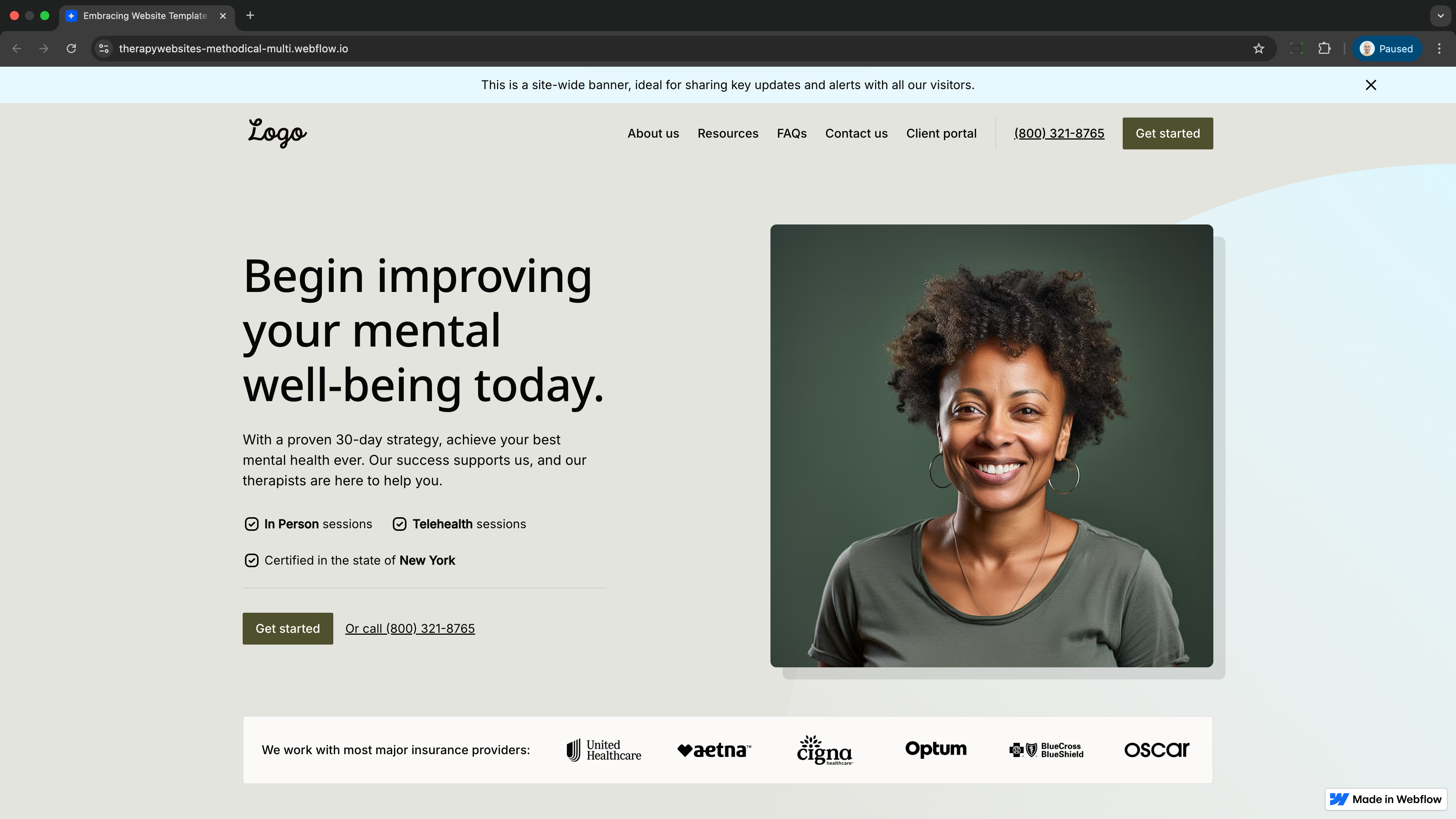 Methodical is a Webflow template specifically designed for mental health practices, aiming to offer a warm and modern digital presence. Its versatile structure allows you to adjust its elements to meet your goals. Featuring a neat and professional design, it's perfect for displaying your areas of expertise, the people you serve, and your approach, facilitating easy appointment scheduling. Embrace gives you everything needed to highlight your value and build trust.